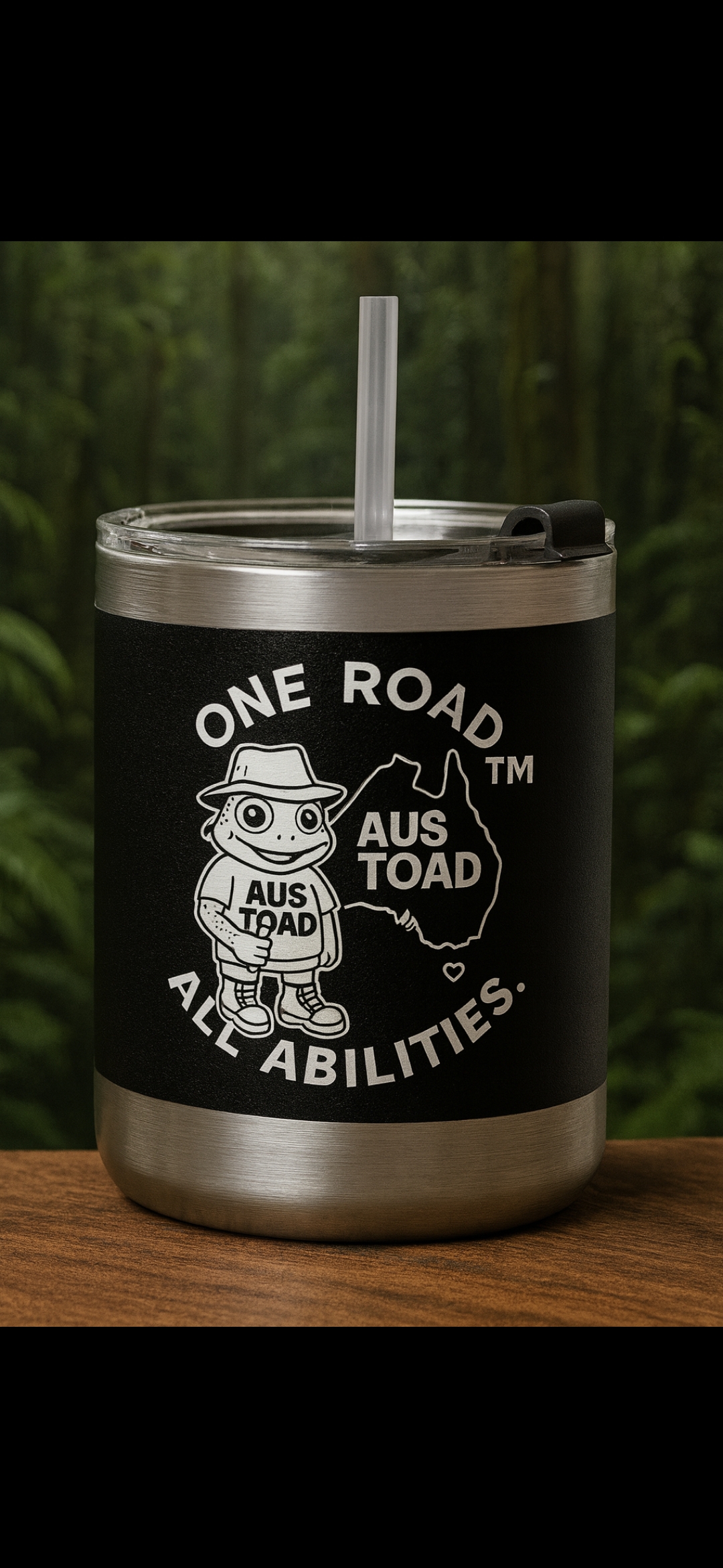 AUSTOAD ‘One Road All Abilities Tumbler Keep your drinks chill as a toad in the shade. this AUSTOAD tumblers tougher than a Landcruiser on a corrugated dirt track-built to survive coffee spills, outback dust, and the occasional curious kangaroo. whether its a hot brew, iced latte, or just good ol ,hydration, this cup got your back. sip proudly knowing you’re repping One Road All Abilities- because life’s too short for boring mugs and flat roads.